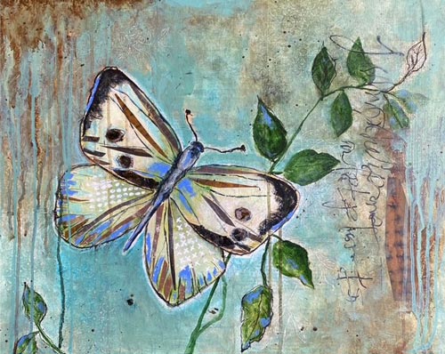 Michelle's process often begins with vintage or hand-painted papers collaged onto the substrate then stenciling over that with a thick medium like Venetian plaster to created raised patterns and texture. After sketching the images, the painting begins with light layers and building to darker areas as the piece progresses. The goal is to keep the image loose and imperfect. Layers of paint and plasters create depth and interest, and sketchy marks using Stabillo pencils or other tools are added along with mica flakes to add dimension.